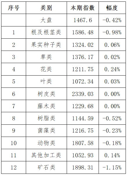 据对亳州中药材价格监测显示,2025年4月份第一期亳州中药材价格大盘指数为1467.6点,与上期1473.86相比,下跌6.26点,跌幅0.42%。结合12类分类指数呈现“5涨5跌2持平”的态势。其中果实种子类1324.02点,上涨0.06%;草类1376.17点,上涨0.02%;花类1211.75点,上涨0.24%;叶类1072.34点,上涨0.03%;其他加工类1052.93点,上涨0.14%;根及根茎类1586.48点,下跌0.98%;树脂类1144.59点,下跌0.52%;菌藻类1216.75点,下跌0.23%;动物类1807.58点,下跌0.18%;矿石类1898.31点,下跌1.15%。