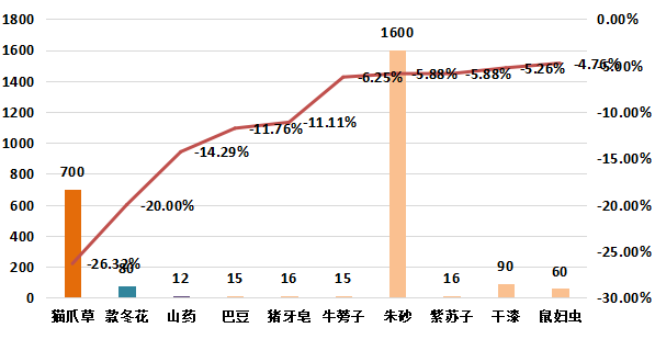 牛蒡子:产地、市场滞留货源均较丰厚,走势低迷,产地价格在13-14元;市场净货15-16元。