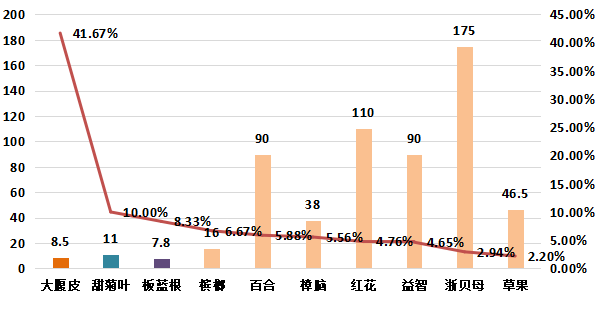 本期大盘品种涨跌环比分析显示,涨价品规占比1.82%;跌价品规占比3.19%;平价品规占比94.99%。近期产新品种不断增多,部分新货随着产量的增减而出现小范围波动,总体中药材行情仍处于平稳运行阶段。