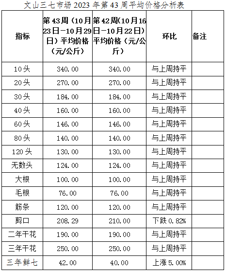 文山三七市场调查统计,2023年第43周(2023年10月22日~2023年10月29日),市场交易差,进行交易的基本是外地流通商,本地流通商及流通企业基本没有交易,除三七剪口价格较上周略有下滑外,其余各规格三七价格与上周持平。