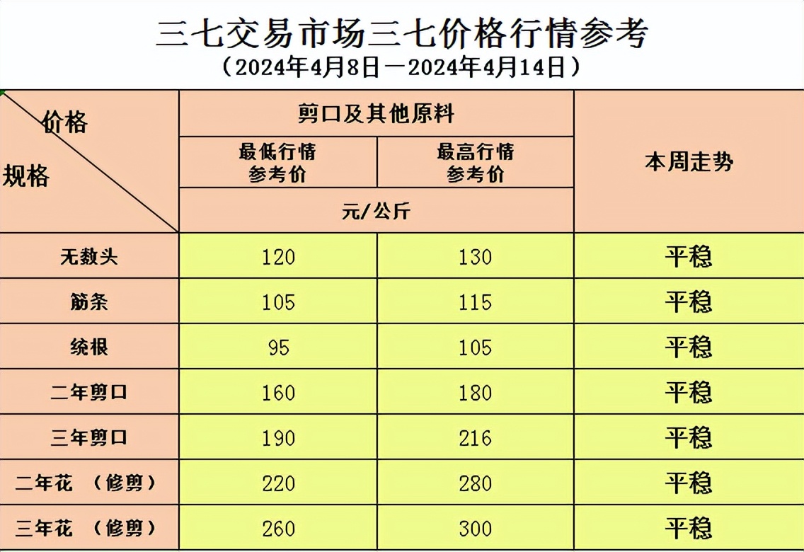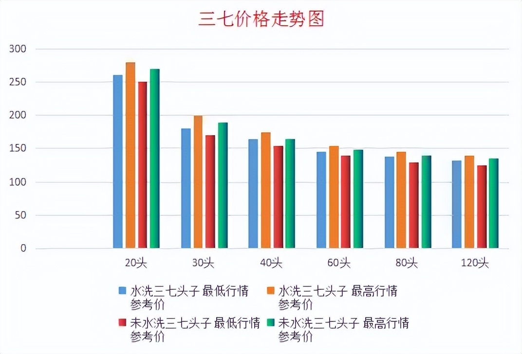 参考价格是经过多方面收集及市场询问后综合整理得出,三七原料因规格大小、品质好坏、春冬七差异、年份长短、外观形状、干湿度、夹杂疤七比例、泥土及灰分的多少、是否经过水洗等决定最终成交价,故相同规格的三七原料价格有高有低不固定。