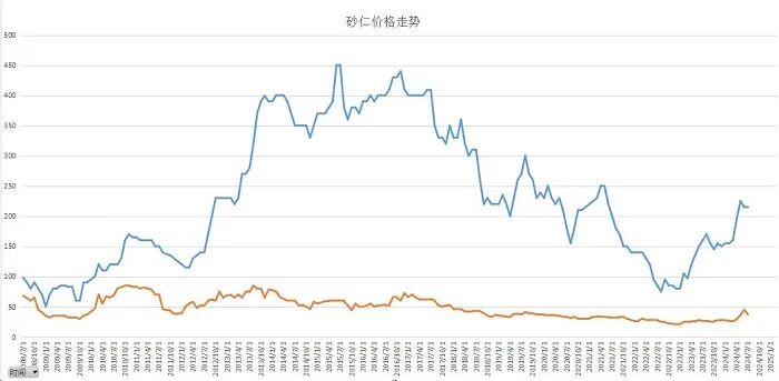 蓝色曲线是国产砂仁走势,黄色曲线为进口砂仁走势。用图表对照基本面思考一下,当前的价格能不能刺激生产?达到什么价格才能刺激生产?产能什么时间能够恢复?有了答案之后就知道后期大概的走势了。