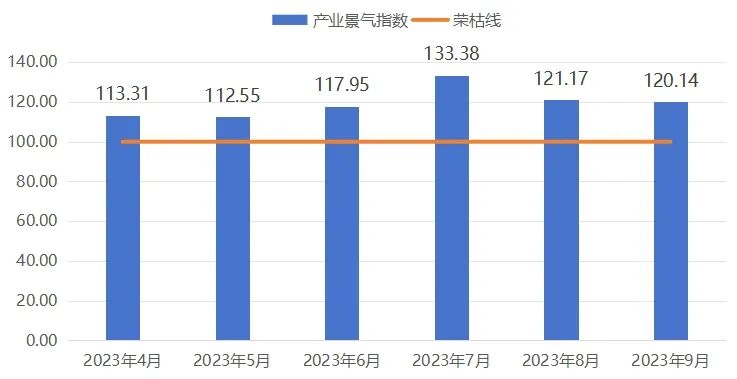 产业规模指数显著提升,三季度指数为147.56点,较二季度上升56.76点。受酸枣仁生产季节性特征影响,一二季度为行业淡季,相关企业数整体减少,酸枣仁产业总产值有所下滑,同时采摘及加工高峰期过后从业人数流失明显,导致产业规模指数持续下滑。而进入三季度以来,新酸枣逐渐上市,并且在酸枣仁价高刺激影响下,吸引酸枣仁产业相关从业人员快速回流。通过产业规模细分指标监测显示,2023年三季度产业从业人数较二季度实现倍增,产业总产值也相应快速提升,带动产业规模指数大幅增长。产业贡献指数持续回暖,三季度指数为114.33点,环比上升19.71点。一方面,在三季度酸枣仁产业总产值增长影响下,酸枣仁产业人均产值、酸枣仁产值占GDP比重都有增加,酸枣仁产业贡献程度进一步加大,指数有所回暖。另一方面,受酸枣仁目前价格较高影响,各地出现酸枣争相高价收购、抢货的现象,市场存在一定的囤货现象。同时三季度为新一轮酸枣采摘季节,酸枣购入多、销售少,同时酸枣收购成本进一步增加,酸枣仁经营主体利润空间有所收窄,数据显示,三季度酸枣仁经营主体利润总额指数为92.08点,环比下跌33.88点。因此在利润下滑影响下,产业贡献指数虽有上升,但整体上升幅度较产业规模小。品牌打造指数突破上行,三季度指数为138.56点,较二季度上升17.8点。三季度,“赞皇酸枣仁产业发展大会暨中药企业20强赞皇行” 活动成功举办,引起了各大主流媒体的争相报道,并同时也发布了赞皇酸枣仁区域公用品牌战略,开启了品牌引领赞皇酸枣仁产业全产业链高质量发展新征程。其中品牌打造指数细分指标网络媒体报道数指数环比上升71.19点,是推动品牌打造指数上行的主要原因。2023年三季度,赞皇酸枣仁产业景气指数波动运行,指数始终保持在景气区间运行,具体运行情况如下:酸枣仁产业景气指数运行走势
