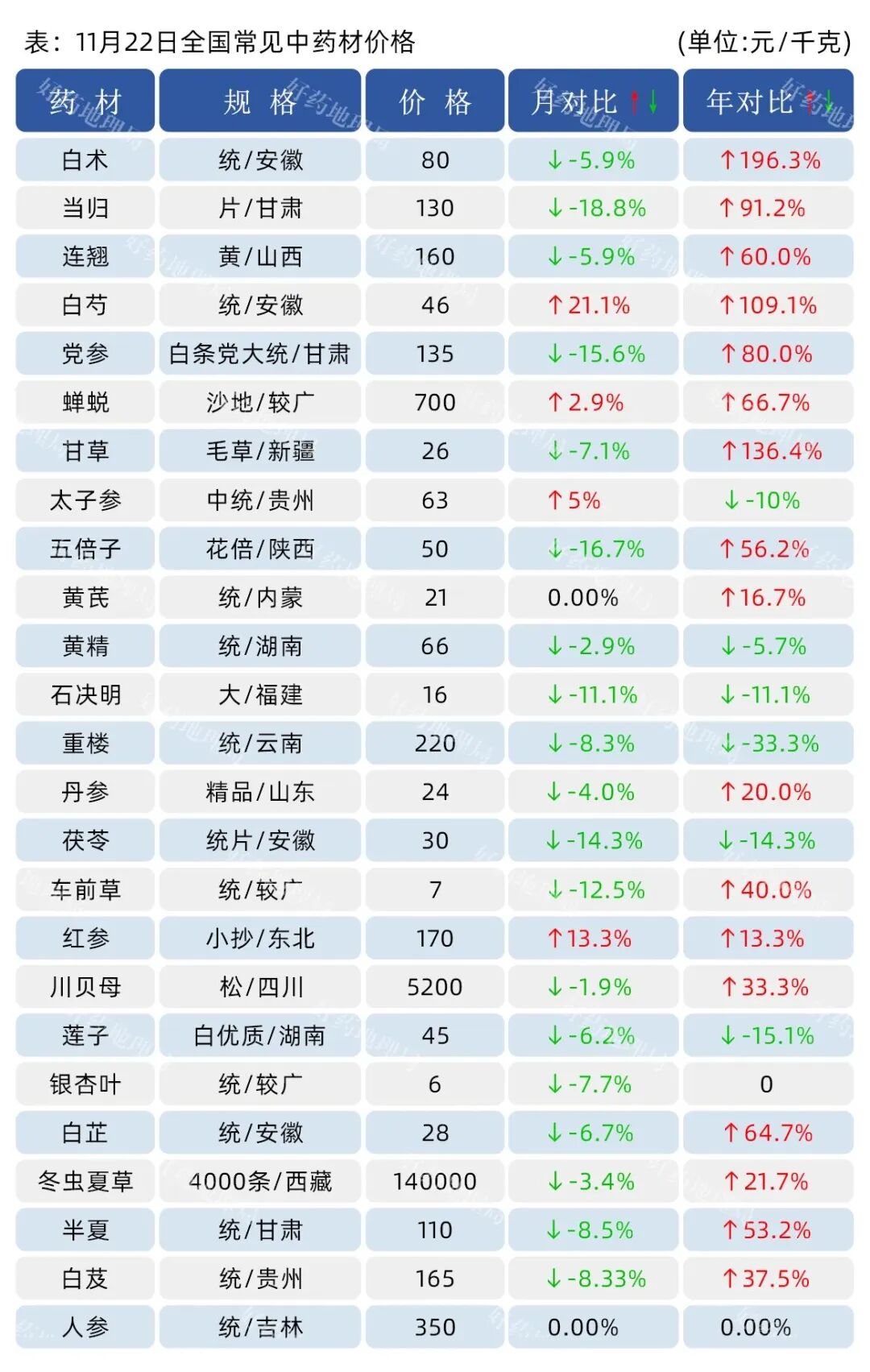 防风:家种防风新货大量产出,河北籽播货售价29-30元,秧栽货尚未产新;内蒙家种货价格差距逐渐缩小,统个价格在31元左右。