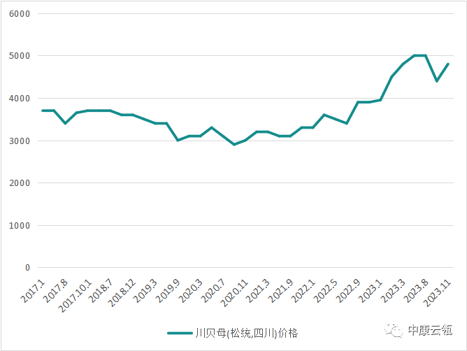 从线上和线下市场调研可以看到,市面上销售的川贝母产品品牌众多,价格差异巨大,零售价格从每克0.2元到15元不等。川贝母卖的到底贵不贵?它是“刺客”还是物有所值?本期,中康云瓴中药大数据中心根据产销数据对该品种行情做一分析。图:2017-2023年药材市场川贝母价格走势(单位:元/千克)由于川贝母长期以来基本以野生货源供应市场,导致价格一直呈现螺旋式上升态势,从2000年开始价格经历了三个阶段:第一阶段(2000-2008年):价格低点在2000年的450元(千克价,下同),价格高点出现在2007年的1400元,涨幅2.1倍。与家种品种不同,野生品种价格上涨过快,市场需求减少,价格就会小幅回调,市场以消化库存为主,但价格整体呈现上涨态势。第二阶段(2009-2016年):价格低点在2009年的450元,高点在2011年的2600元,涨幅4.78倍。第三阶段(2017-今):价格低点在2017年的2400元,价格高点在2023年的5000元,涨幅1.08倍。市场:川贝母,市场货源不多,但由于价格太高,需求方谨慎采购,近期成交量也较小,行情相比前期没有明显变化,现市场松贝价格在5000元左右,青贝售价在4100-4200元。产地:四川阿坝松潘县川贝母经销商介绍,该品种属于名贵中药,为野生资源产出,近期货源正常购销,行情在坚挺中运行,现本地松贝统货价4900元,预计后期行情将持续坚挺。2020版药典从植物分类学角度,将川贝母划分为6个基源,分别是川贝母、暗紫贝母、甘肃贝母、梭砂贝母、太白贝母和瓦布贝母。商品名或习称分别为青贝、松贝、炉贝、秦贝、大贝等。川贝母的主产区在四川,主要在四川阿坝州,产区集中在松潘县、红原县、若尔盖县、久治县、班玛县、壤塘县等地。野生资源产量低、自然条件下种子数量少、发芽率及成活率极低。栽培品主要为太白贝母,因野生变家种技术的成功,随着太白贝母栽培技术的成熟,目前在重庆、陕西、湖北、甘肃、四川以及西藏林芝等地均有大量种植。据中康云瓴中药大数据中心统计,2022年川贝母产量约788.5吨(含6个基源野生及家种总量)。家种暗紫贝母,在松潘地区如今已发展到农耕平地区域,商品贝生长3年左右可以采收,留种贝一般生长4年结种。暗紫贝母每年3-4月下种,下种3年后的8月前后采挖。按3年周期计算,一亩地种子投入约3.6万元(60元/把,600把/亩),地租600-800元/亩,人力成本每亩约2.7万-3万元,农资化肥和其他投入约1800元/亩。正常情况下,每亩地平均亩产商品干贝在70-80千克左右。目前产地松贝干货售价在4900元,每亩产值约34.3万-39.2万元,扣除成本6.8万元之后,三年累计收益在28万元左右,平均每年9万元左右,这样的效益在藏区而言还是非常可观的。虽然种植效益高,但种植技术的掌握与否以及日常田间管理的精细化要求是否达到,都有可能让家种效益产生明显差异。我平台调研了解,目前家种川贝母基本都是大型种植户和大型企业在种植,农户自发种植者不多。川贝母是润肺止咳的名贵中药材,应用历史悠久,疗效显著。由于其不仅具有良好的止咳化痰功效,而且能养肺阴、宣肺、润肺而清肺热,是一味治疗久咳痰喘的良药,因此,在许多治疗急性气管炎、支气管炎、肺结核等病症的中药方剂或中成药制剂中都有川贝母,如蛇胆川贝露、川贝枇杷露等。在中成药需求方面,通过对平台监控的中成药品种进行筛选,目前有254家企业生产147种中成药中含有川贝母。药材原料需求靠前的中成药有蜜炼川贝枇杷膏、蛇胆川贝枇杷膏、养阴清肺合剂、蛇胆川贝散、润肺膏等;原料需求靠前的企业为香港京都念慈菴总厂有限公司、广州白云山潘高寿药业股份有限公司、湖南新汇制药股份有限公司、山东润中药业有限公司、广州粤华制药有限公司等。据中康云瓴中药大数据中心统计,2022年川贝母市场总需求量约在3800吨左右,供需缺口较大。1、市面流通的太白贝母不多 直到2010版药典正式收录太白贝母作为川贝母的新增基源,该品种才逐渐获得关注,加之其含量达标,价格低于松贝、青贝,逐渐得到市场的认可,用量逐渐扩大。但受伪品冲击以及目前认知度不及川贝母,价格只有川贝母的一半,应是合理的。2、2023年川贝母市面8-10元/克价格比较合理 2023年,药厂松贝采购价格在5000元上下,如果饮片企业加工需要保证25%的毛利,出厂价格6250元,药店同样要保证自己有25%左右毛利,那么零售价至少在7812.5元。至于有些品牌川贝母饮片可以卖到15元/克的零售价格,一是消费者一般买的量比较小,二是有品牌溢价,消费者更相信品牌产品。3、掺杂使假情况严重 正因为川贝母资源的稀缺性和供需缺口,市场上流通的川贝质量堪忧,主要是掺入小平贝甚至小浙贝。综上所述,川贝母属于稀缺资源,资源稀缺程度差不多和虫草相当。由于家种需要用野生种源,如果种植不成功也会进一步导致产量降低。市面上低于7元/克的川贝母要么是掺杂了其他贝母,要么就是多年前的低价陈货,需要仔细甄别。