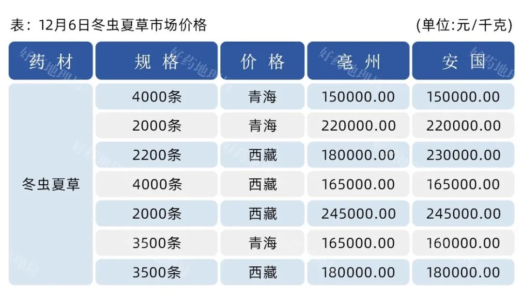 今年由于原草价格居高不下,市面商家货源不多,近期多以随购随销为主,虽然近期走销一般,但行情持续坚挺。现市场青海草4000条价在14-15万元。3500条要价16-18万元。冻干草大小不一售价为8-12万元。西藏草价格略有不同(见下表)