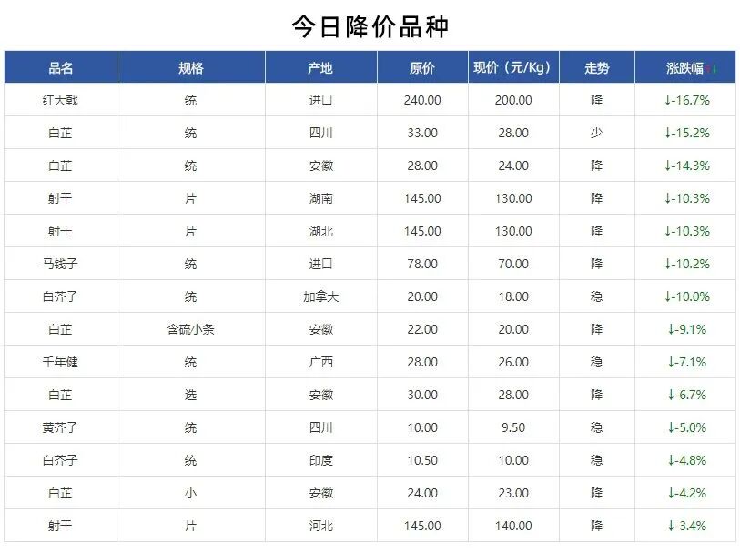中药材市场在舆论和政策的双重影响下,让供大于求导致的下跌形式更加严峻了。今天,又有多个品种下跌,红大戟、黄芥子、白芥子、射干、白芷、马钱子、千年健纷纷因实际需求有限下跌,其中白芷和射干是全线崩塌,无一规格幸免。