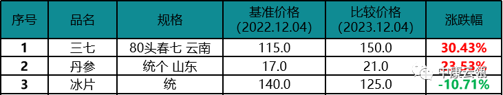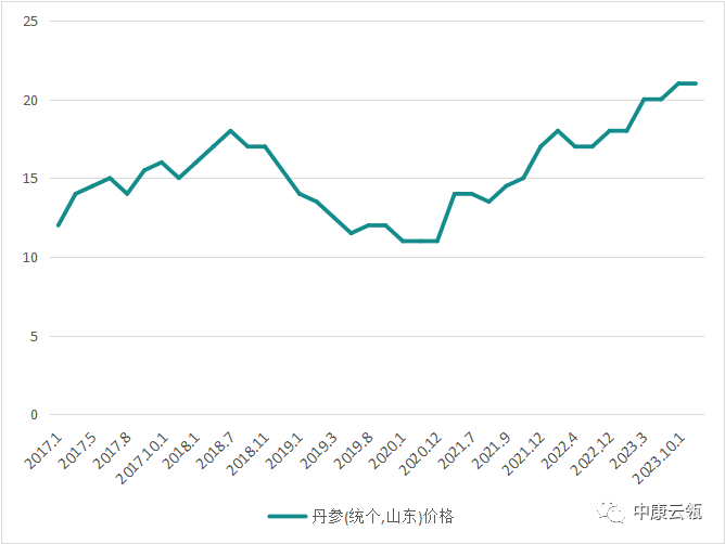 该药可用于治疗气滞血瘀导致的胸痹,缓解胸闷、心前区刺痛等症状,对治疗冠心病、心绞痛有一定效果。表2:复方丹参滴丸/片核心原料价格涨跌(单位:元/千克)复方丹参产品的核心中药原料在2022年12月-2023年12月期间,上涨品种2个,占比66.7%;下跌品种1个,占比33.3%。 丹参,山东产地开始产新,今年新货产量不大,产地行情小幅上涨,但市场货源供求平衡,目前商家关注度不高,行情在近期继续走稳,现统货价格在21-23元(千克价,下同)之间,丹参粒一般货价格在26-30元不等。三七,由于前期价格不高,三七受到资金关注,行情出现一波上涨,近期商家关注力度一般,货源正常购销,现市场三七120头货价格在140元,80头货价格在150元,60头货价在155-160元之间,40头售价在175元,30头售价在200元,20头售价在235元。冰片,市场库存充足,近日需求一般,购货商家不多,且货源小批量走动平稳,价格尚无明显变化,目前市场统货多要价在120元左右。图1:丹参2017-2023年市场价格走势(单位:元/千克)
