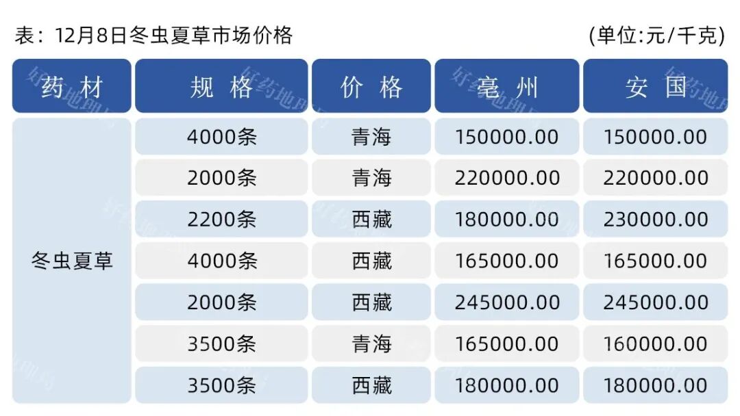 进入冬季以来,稀缺品种川贝母成为热点品种,但是冬虫夏草同样作为稀缺品种,却没成为热点品种。虽没成为热点品种,但价格却依然保持坚挺,近期市场货源走动保持平稳,亳州市场有小批量购货,安国市场零星购货为主。青海草和西藏草价格均无变化。预计十二月上旬 冬虫夏草行情难有波动,因为没有大需求刺激。