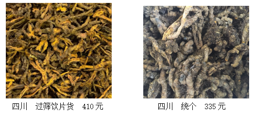 2022年黄连各产区遭受了50年未见的极端高温天气,干旱天气导致在地黄连一定面积受损枯萎,其中2-3年生的受灾较为严重,在此背景下,黄连货源走畅,行情开启了周期上涨之路,所以“旱灾”是本周期行情上涨的导火索。目前产地黄连产新告一段落。黄连亳州市场近期处于缓慢消化,且价格出现高位震荡,目前亳州市场鸡爪连多要价330元左右,黄连片要价380-410元不等,而单支连报价在320-330元之间不等;陈货多要价在290-300元之间不等。与2020年的黄连价格是天和地的区别,目前产地与亳州市场黄连走动迟疑黄连后市充满着变数。