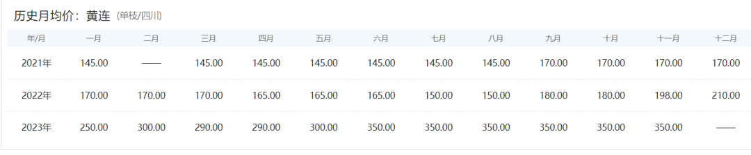 2022年产新之后的黄连迅速从180元附近拉高250元,市场黄连的走动迅速,几乎市场黄连一消清空,到今年23年亳州药行开门迅速拉高至340元附近。