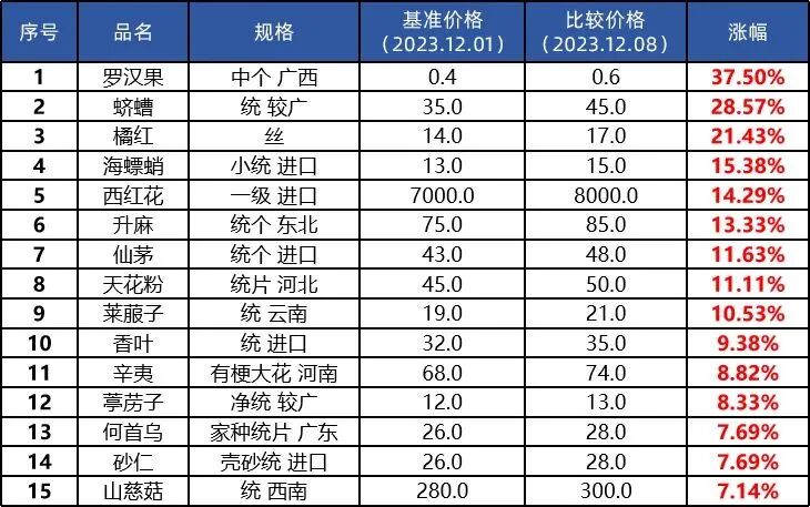 上涨的品种多数为小冷品类,有罗汉果、蛴螬、橘红、海螵蛸、西红花、升麻、仙茅、天花粉、来负责等。其中,涨幅超过20%的仅有三个,罗汉果涨幅37.5%,跃居第一。