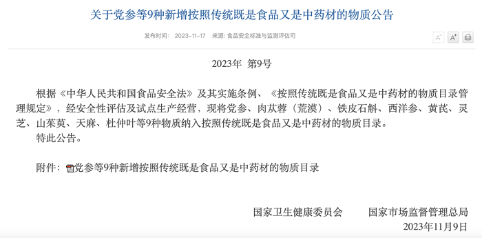图1:国家公布的9种药食两用新进品种公告。