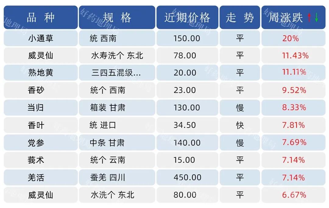 小通草:市场通草减产,且货源存量减少,行情补涨。现市场贵州、云南大通草统货价410-430元,湖北、贵州小通草350-380元左右,四川绣球小通草150-155元。