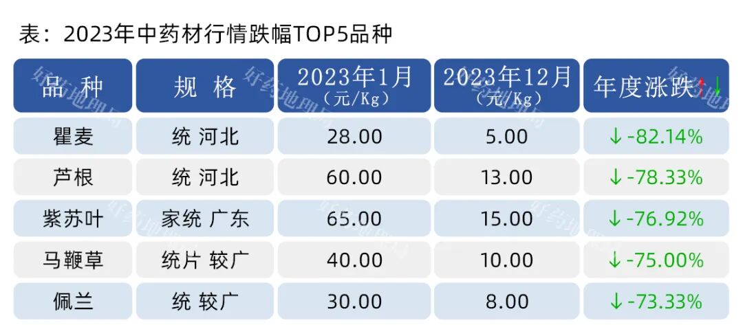 中药材价格从七、八月后逐渐进入下跌,临近金秋旺季,中药材市场没有出现往年的价、需齐涨的旺季景象,反而出现成交量不足、价格下跌的市场走势。其中,瞿麦年度下跌82%,位居年度跌幅榜首。