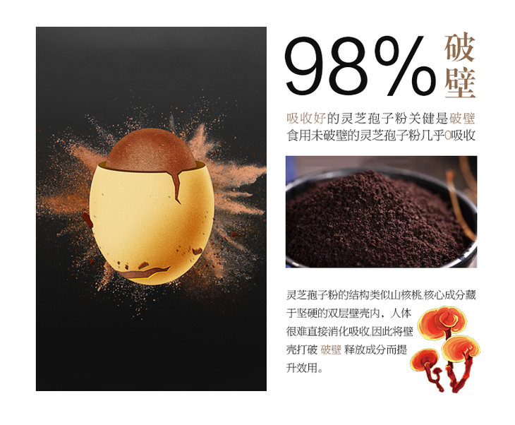 因为灵子的种子虽然微小,但是比核桃壳还坚硬,保护着里边的精华。不过下面推荐的这家【象记养生】的灵芝孢子粉破壁率高达98%以上,也就是你98%都能轻易吸收。