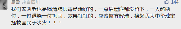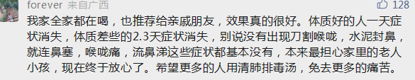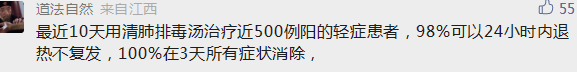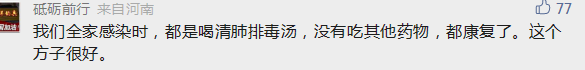 在专家学者对中医药治疗新冠病毒感染全面噤声的严峻情势下,依然有一些地方还是没有忘记中医药抗疫的巨大作用。我们欣喜地看到,健康青岛公众号在12月24日公布了所有的可以提供该方剂的医疗机构名单。据称,有100多家医疗机构为患者提供清肺排毒汤。一位网名叫念昔的网友说,“我是青岛的,喝了清肺排毒汤两付,每天一副,喝了第一付便退烧了。”网友Me.艳子也分享了自己的感受:“身为青岛人,我也在喝,身边不少人都喝了,确实有效果,而且可以走医保。”玩水族-孙帆:“我是青岛胶州的,当地中医院都有熬制,我们当地中医院还有公众号给宣传连夜熬制,昨天问的我大娘,喝了两袋,感觉恢复很快,肺部舒服,也不怎么咳嗽了!”据网友爆料,北京市西城区新冠肺炎疫情防控工作领导小组委托江阴天江药业有限公司生产了清肺排毒汤颗粒,给辖区40多万户居民发放的抗疫包中就有清肺排毒汤(颗粒)。在这里,我们为这些把人民利益放在首位,有担当的政府部门给予点赞。清肺排毒汤做成大锅汤可以用于群体预防,俗称“大水漫灌”,能使阳性患者很快转阴;院内用于病人救治辨证论治,能使轻症不会发展为重症,危重症转为轻症,从而治愈。一个方子具有广谱性,是因为疫情的发病病机是一样的,都是“寒湿”。一个方子能够预防传染,又能治疗感染,清肺排毒汤是中医史上的一个传奇。清肺排毒汤怎么用?有的人感冒后有发烧、咳嗽症状就用,效果还不错。风寒袭表引起的风寒感冒主要症状是发烧、怕冷、咳嗽、身痛腰痛。骨节疼痛。新冠病毒感染初期症状和感冒基本一样。但它的主要目标是侵犯肺,是整个呼吸系统受损。肺为娇脏,耐不得一点病邪,有了病邪首先就是要用咳嗽的方法把病邪给排出去,所以表现的首要症状就是咳嗽。体质好的,受寒或者被病毒传染后,会发烧,但不一定会咳嗽,说明病邪还没有到达肺脏。体质弱的,病邪就会长驱直入,直接引发咳嗽。如果发烧不能及时降下来,咳嗽就会因为发烧而逐渐加重。体质弱的,比如脾胃虚寒的,运化水湿无力,就会形成痰湿储藏在肺里,外邪引动之后,一边咳一边嗽。因为体弱,咳嗽时间一长便会乏力,越是咳不出来越要用力咳,咳到胸痛,痰咳不出来,阻滞在肺里,便会感到胸闷,呼吸困难。所以,当表现为发热、长时间咳嗽、气喘、胸脯憋闷、舌苔发腻,或者在医院检查出白肺的,要立即使用清肺排毒汤。这个方子,作为预防可以一副做三次喝,作为治疗就要按原方要求喝。这个方子效果好到什么程度,看看下面的反馈就清楚了。陕西网友秦川雨:本人和孩子亲测,清肺排毒汤一剂见效!39直接降到37.4,太有用了。我们当地中医还在这个基础上,调剂出了“清肺排毒止痛汤”和“逐邪扶正汤”,太赞了。道法自然:最近10天用清肺排毒汤治疗近500例阳的轻症患者,98%可以24小时内退热不复发,100%在3天所有症状消除。最后,希望医院不要单打独斗,要取长补短,需要清肺排毒汤时及时用上。虽然不赚钱,但是能救命。