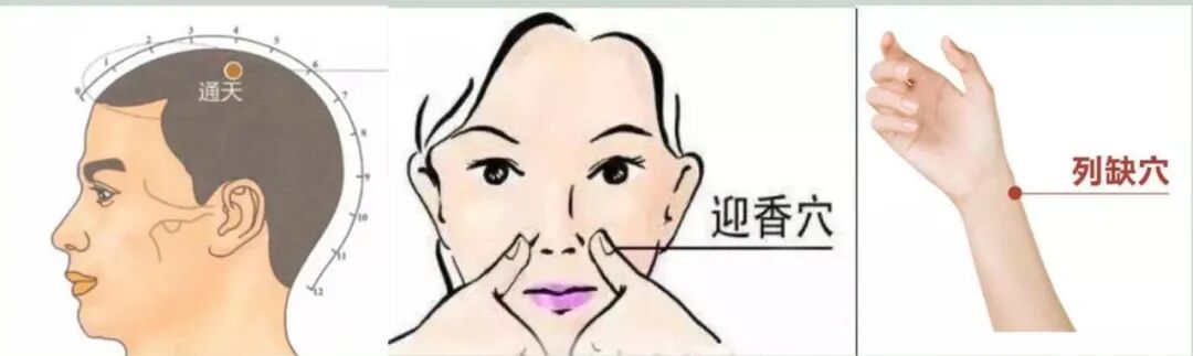 选取通天穴、迎香穴、列缺穴,依次用指尖或指关节点按穴位,每穴按压5-10分钟,可重复做,每日2-3次。