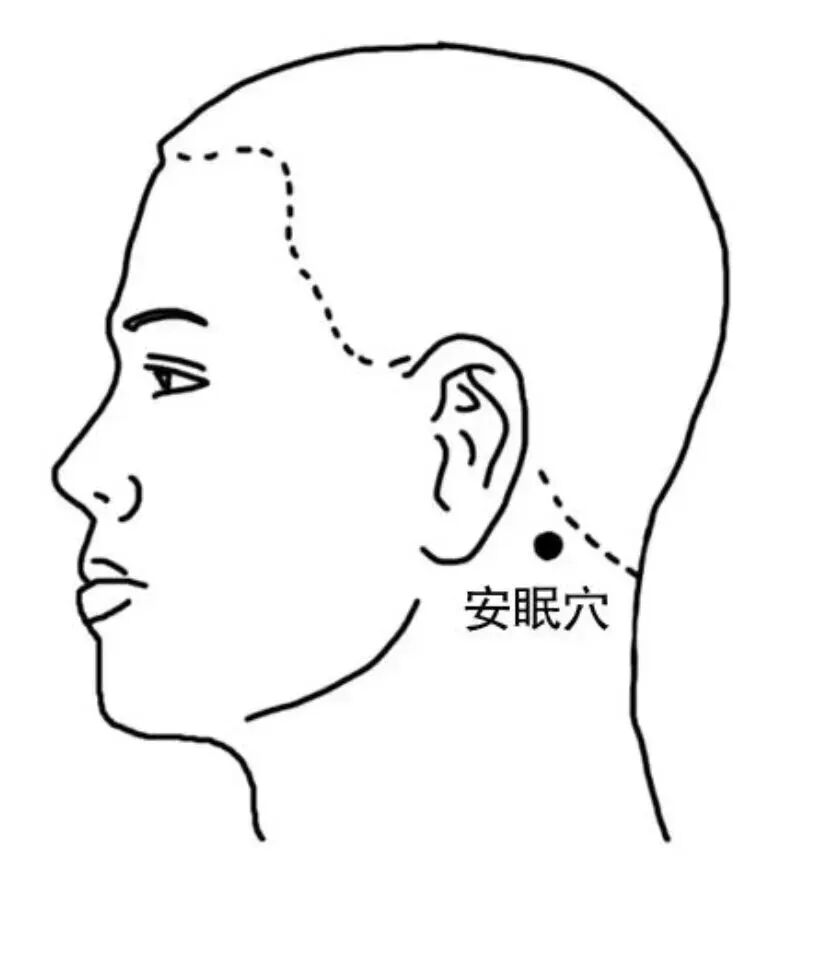 安眠穴在翳风与风池两穴连线之中点。为经外奇穴,是治疗失眠的经验效穴。