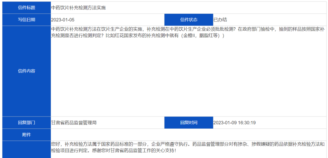 回复内容:您好,补充检验方法属于国家药品标准的一部分,企业严格遵守执行。药品监督管理部分对有掺杂、掺假嫌疑的药品依据补充检验方法和检验项目进行判定。感谢您对甘肃省药品监管工作的关心支持!