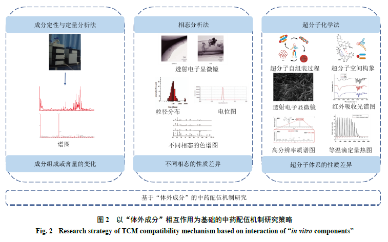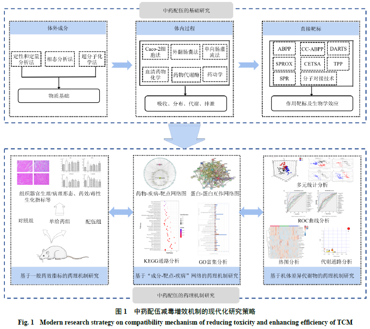 复方是中医临床上遣方用药的主要形式,配伍是复方精华之所在,其在“四气五味”“七情合和”及“君臣佐使”等药性及配伍理论指导下,各中药饮片通过配伍发挥协同增效和/或拮抗减毒作用。仅从饮片配伍与药效关系的层面研究,很难阐明中药配伍的科学规律,配伍机制的研究正朝物质基础与生物效应相互关联的方向发展。然而,中药体外成分复杂、体内过程繁琐和直接靶标情况不明确等限制了其配伍减毒增效机制的研究。且中药配伍后具有多药物、多成分、多靶点与多途径发挥治疗疾病或减轻毒性损害的特点,仅从成分或靶点等单一层面研究中药配伍减毒增效的作用机制,无法全面阐释中药配伍的合理性。因此,如何全面系统地揭示中药配伍减毒增效机制是中药配伍现代化研究亟待解决的难题。近年来,一些新技术、新策略的提出,极大地推动了中药配伍减毒增效作用机制的研究,如超分子化学研究、相态拆分研究、基于化学修饰/非修饰的直接靶标研究等技术,网络药理学和代谢组学等多学科技术融合研究策略,从新的视角揭示了中药配伍机制,诠释了中药配伍理论的科学内涵。本文通过综述近年来中药配伍机制研究的技术与进展,提出以“体外成分、体内过程、直接靶标”研究为基础,“中药配伍药理机制研究”为目的,从不同角度和不同层面探索中药配伍后的作用机制,并提出以多学科技术融合探索配伍减毒增效机制的现代化研究策略(图1)。中药所含活性成分是中药发挥疗效的物质基础,体外成分的复杂变化是研究配伍机制的基础和重点。色谱和质谱及其联用技术已被广泛应用于中药活性成分的定性和定量分析,发现中药配伍后各药味主要通过以下单一或多个反应实现减毒增效作用:(1)减少毒性成分的溶出;(2)促进活性成分的溶出;(3)生成新的活性物质。通过定性和定量分析研究配伍前后成分的组成及含量变化,可初步阐明中药配伍减毒增效的机制,但存在一定局限性。中药复方在煎煮过程中常伴随一系列复杂的变化,其汤液大多呈现混合相态体系,包括真溶液相、胶体相、混悬相和沉淀相等,中药配伍减毒增效作用不仅由多种相态下的化学成分主导,还与不同释药行为密切相关。因此,基于相态分析的方法被引入中药配伍后减毒增效机制的研究中,郭玉岩等发现马钱子与甘草配伍后其毒效成分均有所减少,且主要集中在沉积物相态,由于沉积物相态的缓释作用,可长时间发挥药效,并维持平稳的药物浓度,是实现减毒增效作用的关键。吕邵娃等认为白虎汤纳米相态对解热成分及解毒成分起到了增溶作用,其强效解毒解热作用的机制与纳米粒子的形成有关。此外,中药复方在煎煮过程中会出现自沉淀现象,传统中医认为自沉淀应与中药汤剂同服,自沉淀是中药配伍科学内涵的外在表象。雷海明团队研究发现自沉淀部分存在药效,其作用甚至强于上清液,自沉淀形成机制的研究对中药配伍及合理应用具有重要意义。因此,该团队将超分子化学运用于中药配伍合理性的探究,发现配伍后各成分通过静电、疏水、氢键及π-π等相互作用诱导形成多种超分子体系,达到减毒增效的目的。如小檗碱与马兜铃酸在水煎煮过程中产生静电、疏水及π-π堆积的稳定超分子结构,这些结构阻断马兜铃酸的毒性基团硝基和羟基的环化,从而抑制其形成毒性代谢物马兜铃内酰胺,以达到配伍减毒的作用。黄连解毒汤中黄酮苷类有效成分可以与小檗碱于水溶液中在弱键诱导下自组装形成球形和线形超分子,超分子结构的形成会显著影响单体活性,自组装后与前体原料小檗碱相比,对金黄色葡萄球菌的抑制作用和生物膜清除能力明显改变,以达到配伍增效的目的。成分定性和定量分析法、相态分析法和超分子化学法均被用于中药配伍合理性研究(图2)。其中,相态分析法不仅可用于配伍机制研究,还可用于不同相态中毒性和活性成分的分析,尽可能除去毒性较大的相态,保留毒性成分少、活性成分多的相态部分,使临床用药更加安全、有效。超分子化学从新的视角揭示了中药配伍后的物质基础,深入研究了中药配伍的合理性,使中药复方焕发新的活力。中药配伍产生药效或毒效的作用,不仅源于本身复杂的化学成分和组方配伍后各成分相互作用发生的量或质变化,成分进入机体后在吸收、分布、代谢和排泄(absorption, distribution, metabolism and excretion,ADME)不同环节中的表现同样会影响配伍疗效,因此,研究不同药物成分在体内ADME过程有助于阐明配伍减毒增效的具体机制。近年来,药物配伍后对成分ADME影响的研究方法主要有Caco-2细胞法、外翻肠囊法、单向肠灌流法、血清药物化学、药物代谢酶以及药动学[31]等,各方法比较见表1。中药配伍后对吸收过程的影响主要表现在减少有效成分的外排以促进其吸收,增加药效成分生物利用度,发挥协同增效作用。P-糖蛋白(P-glycolprotein,P-gp)和多药耐药相关蛋白2(multidrug resistance associated protein 2,MRP2)在药物的吸收中起着重要的作用,能够将细胞内的药物外排,影响其生物利用度。研究表明许多中药活性成分是P-gp和MRP2的底物,受二者的外排影响生物利用度较低,而配伍的中药能够作为二者的抑制剂,增加药效成分的吸收。葛根和天麻是治疗心脑血管疾病的传统配伍,药动学实验发现与单一给药相比,二者配伍后能增加大鼠体内6种葛根活性成分的血药浓度,进
