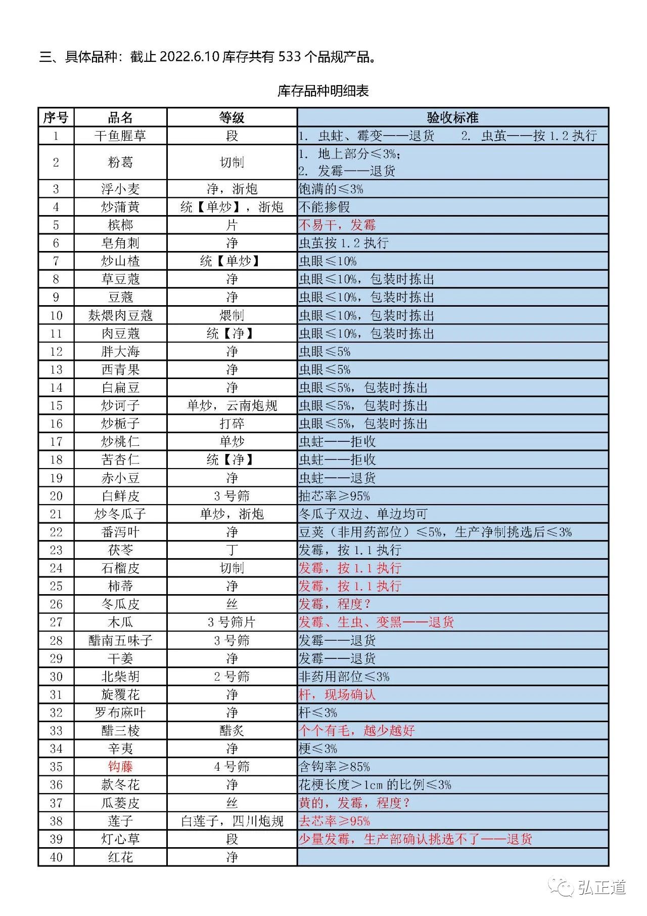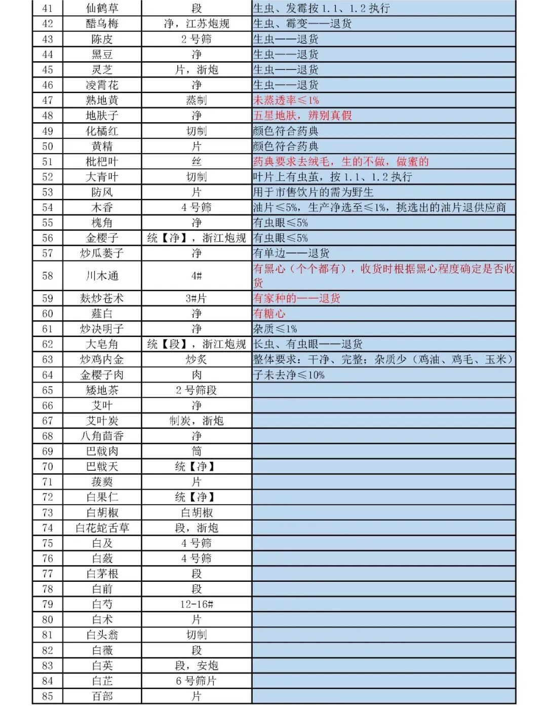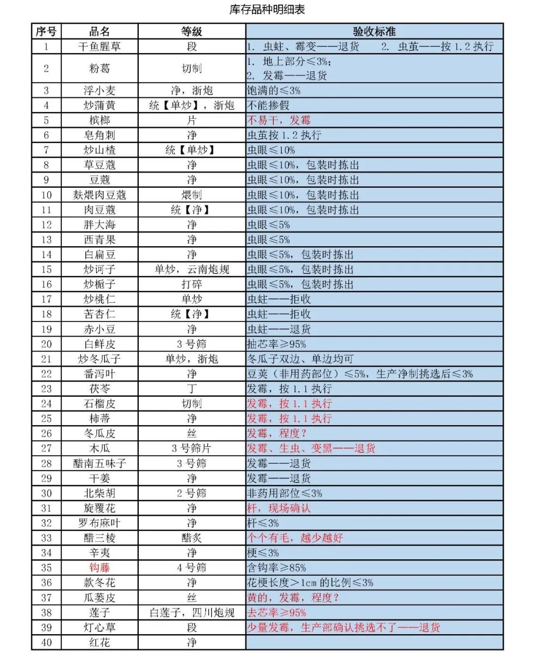 1. 外观:原则上须无霉变、无虫蛀,但因产品性质原因,按以下处理: