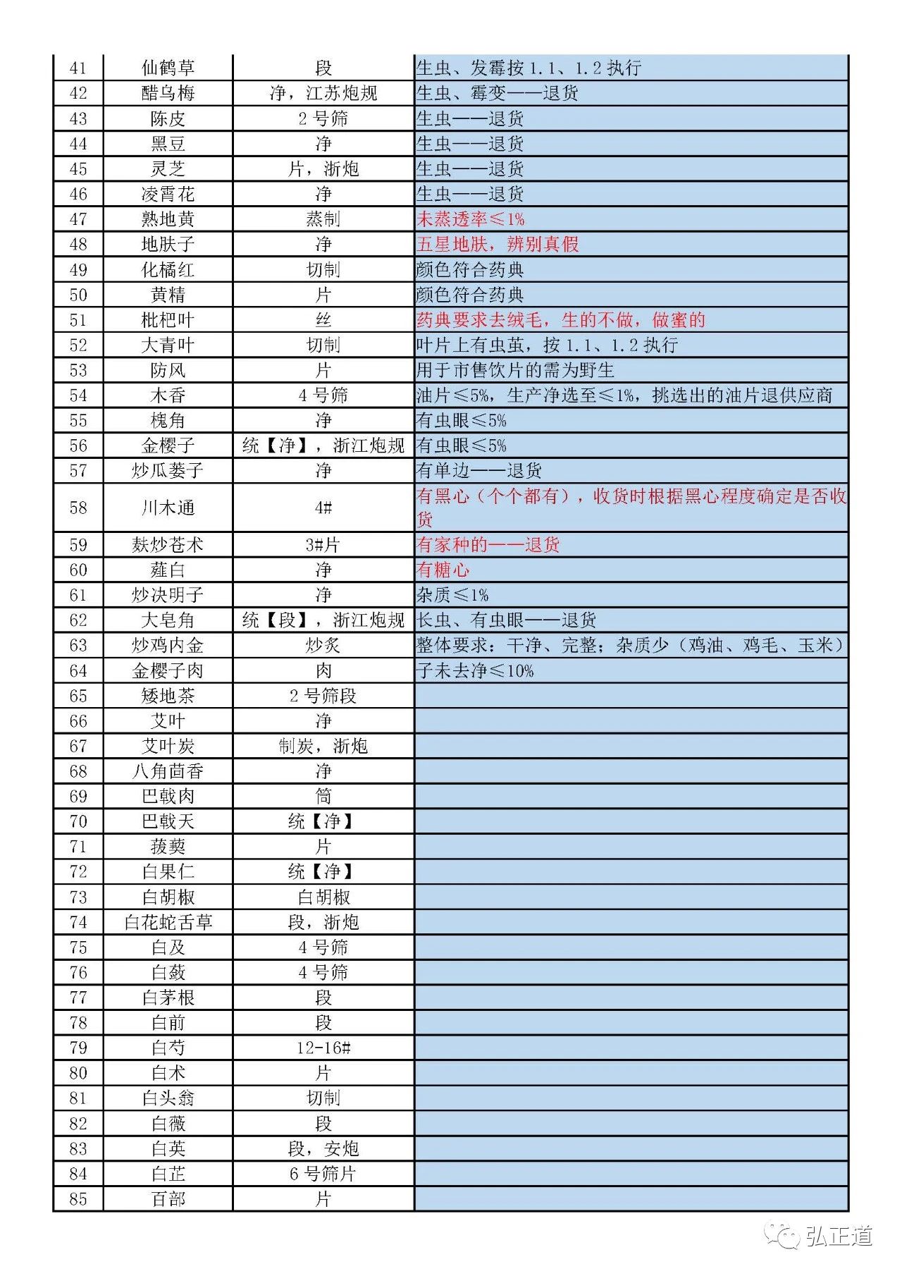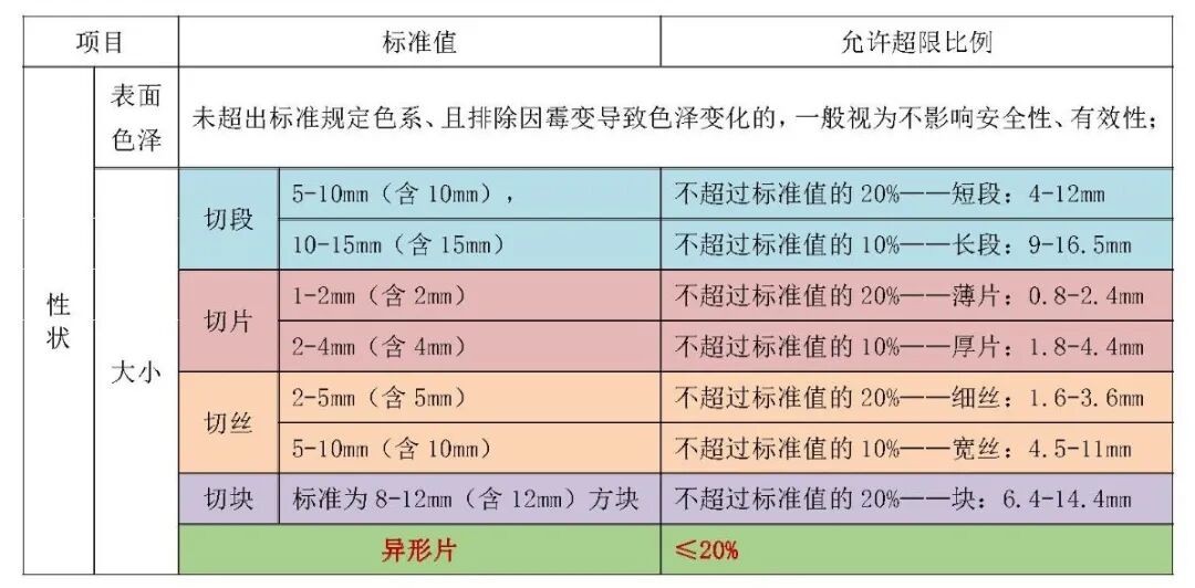 采购的原料按安徽省局2020.12.23发布的《中药饮片不符合药品标准,尚不影响安全性、有效性判定的指导意见》执行,具体见下表(根据药典更正,细丝大小为2-3mm)