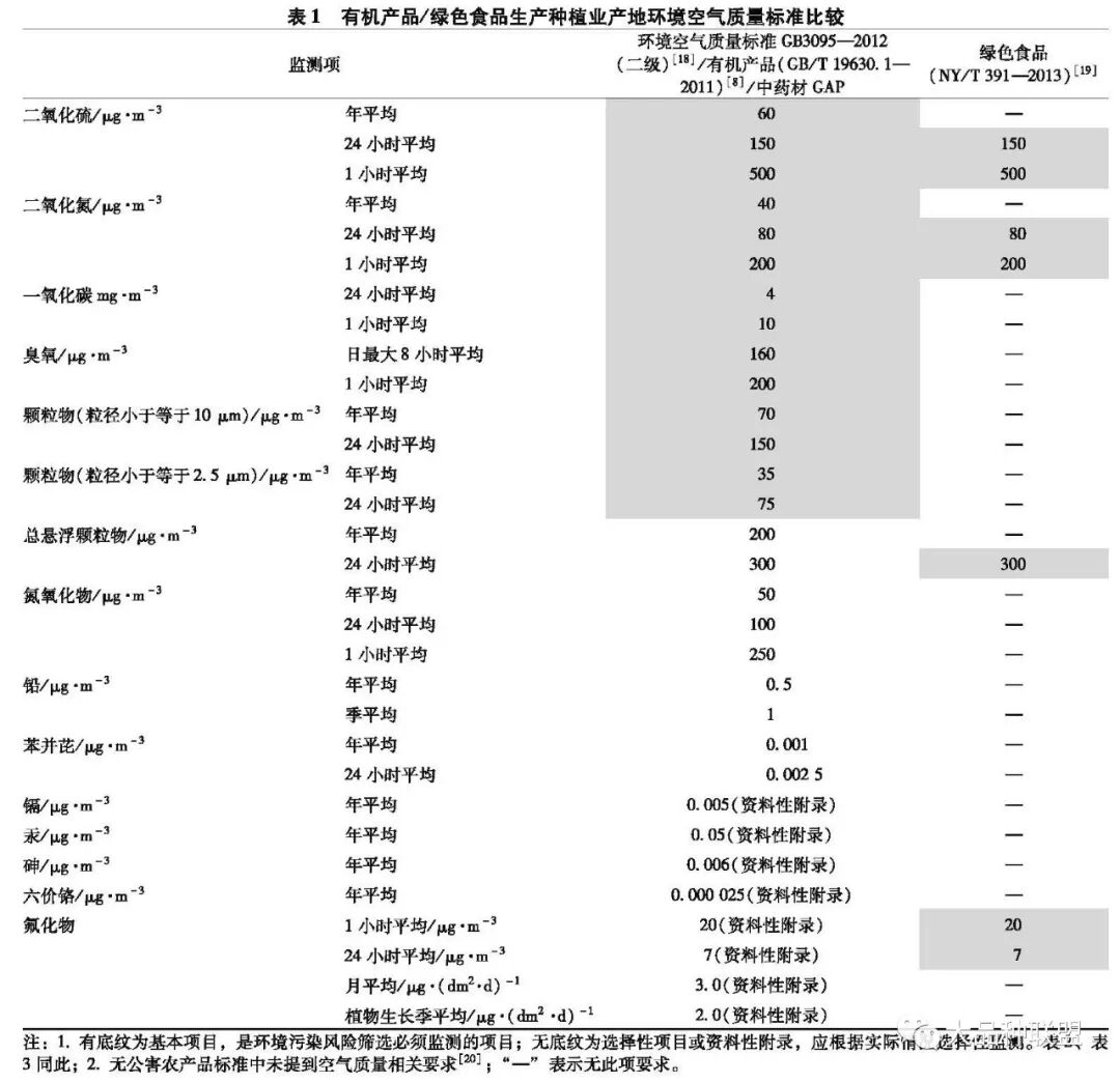 由表1可知,在产地环境空气质量要求方面,有机食品及中药材GAP要求产地空气符合国家《环境空气质量标准》(GB 3095—2012)二级31个指标要求(14个基本指标);绿色食品只要求7个空气指标符合GB 3095—2012二级,数量远少于有机产品要求,但将GB 3095—2012附录性资料中的氟化物一项放入了标准正文中,将参考性资料变成了强制性监测项。无公害农产品生产标准中则未提到空气质量相关要求。可见,有机产品对空气质量的要求总体高于绿色食品,更高于无公害农产品。
