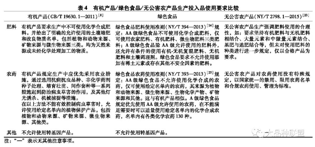由表4可见,有机产品生产中要求不使用化学合成的化肥、农药、生长调节剂、饲料添加剂等物质及转基因产品,可有条件使用植物和动物来源、矿物来源、微生物来源及一些无机化合物和诱捕器等物理方式。绿色食品生产不允许使用添加有稀土元素、使用转基因产品为原料生产和存在其他不安全因素的肥料,且AA级绿色食品生产中不可使用化学合成肥料。AA级绿色食品生产中允许使用的植保产品名单除部分生物化学产物来源外,基本与有机农业一致;A级绿色食品允许有条件使用其他推荐名单内的130种化学合成农药。无公害食品要求肥料合格,农药除农业部统一禁用、限用的农药清单外,没有其他限制。