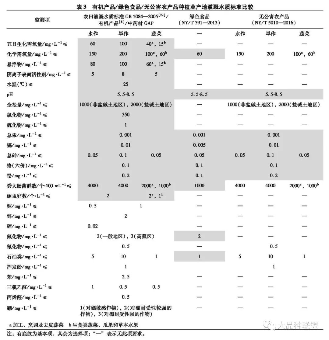 有机产品、中药材GAP要求灌溉水符合国家《农田灌溉水质标准》(GB 5084—2005)全套27个监测项(16个基本项,11个选择项)要求;绿色食品和无公害农产品标准灌溉用水要求项目均少于GB 5084—2005,前者只有10个监测项(均为基本项),后者有12个监测项(6个基本项,6个选择项)。其中绿色食品标准中镉和铅要求更严,粪大肠菌群数、化学需氧量、石油类三项与GB 5084—2005中最严格标准(生食瓜果蔬菜标准)相当,剩余项目要求与GB 5084—2005完全相同。无公害农产品灌溉用水标准除项目少于GB 5084—2005外与其要求完全一致。