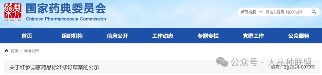 我委拟修订红参国家药品标准,标准编号:《中国药典》2020年版一部。为确保标准的科学性、合理性和适用性,现将拟修订的红参国家药品标准公示征求社会各界意见(详见附件)。公示期自发布之日起三个月。请认真研核,若有异议,请及时在线反馈,并附相关说明、实验数据和联系方式。来函需打印后加盖公章,个人来函需打印后本人签名,并邮寄至我委通讯地址。
