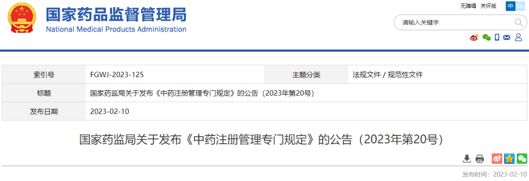 2023年02月10日,国家药监局发布了《中药注册管理专门规定》,全文11章82条,自2023年07月01日起执行。