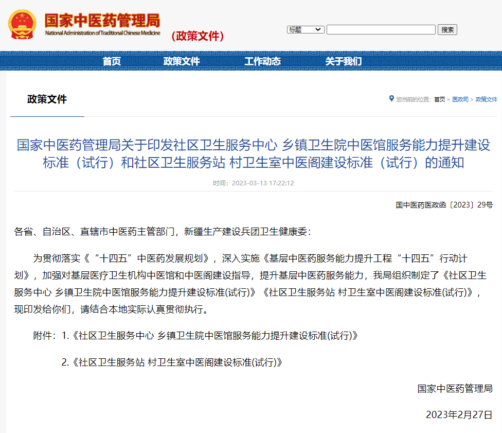 近日,为贯彻落实《“十四五”中医药发展规划》,深入实施《基层中医药服务能力提升工程“十四五”行动计划》,国家中医药管理局制定并印发了《社区卫生服务中心 乡镇卫生院中医馆服务能力提升建设标准(试行)》《社区卫生服务站 村卫生室中医阁建设标准(试行)》,加强对基层医疗卫生机构中医馆和中医阁建设指导,提升基层中医药服务能力,更好地满足城乡居民对中医药服务的需求。