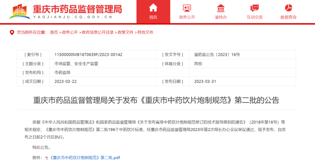 3月31日重庆药监局发布的《重庆市中药饮片炮制规范》第二批196个中药饮片标准公告,自发布之日起2个月后执行。