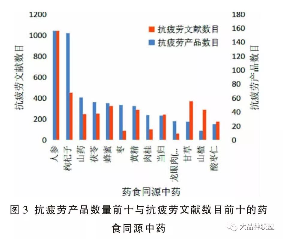 经过对抗疲劳药食两用中药现状分析,发现许多药食同源中药有良好的抗疲劳作用,可以作为抗疲劳药品和产品开发的潜在中药。