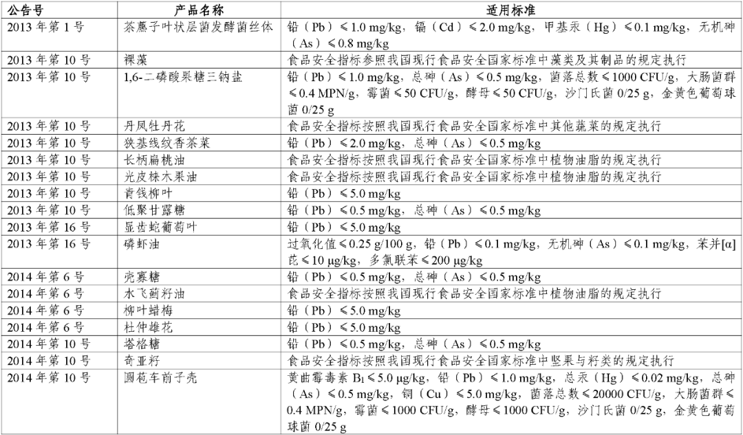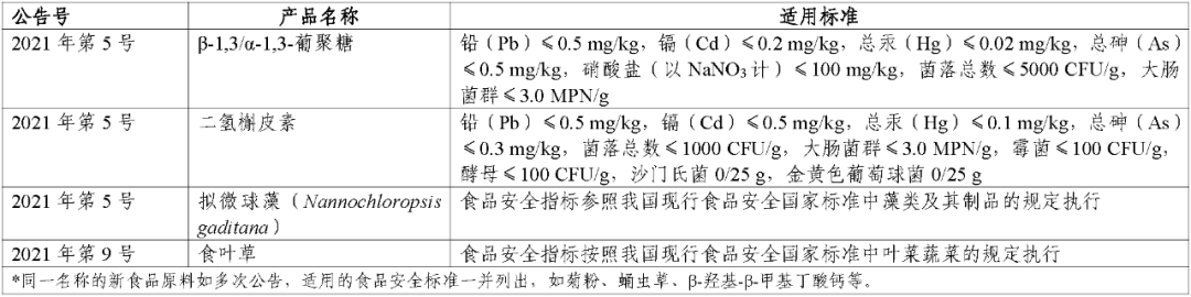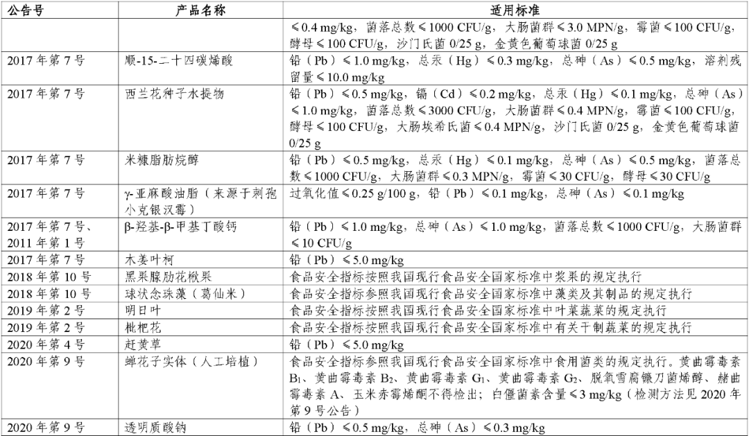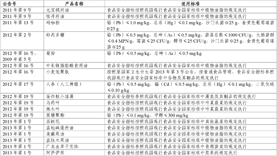 该目录涉及的新食品原料食品安全指标包括过氧化值、真菌毒素、污染物和微生物限量;种属基原、食用量、食用和使用方法、生产工艺、发酵菌、副产物和溶剂残留限量等仍按照发布时公告执行;农药和兽药的使用应符合农业农村部的相关规定。监管部门、行业企业等相关机构在“三新食品”的监管、生产和使用中应按照要求执行该公告的相关标准。对新食品原料目录的食品安全标准设置18个月过渡期,在公告前和过渡期内按照原标准和要求生产的新食品原料,可销售和使用至保质期结束。2022年以后公告的“三新食品”的食品安全指标按照发布时公告要求执行。