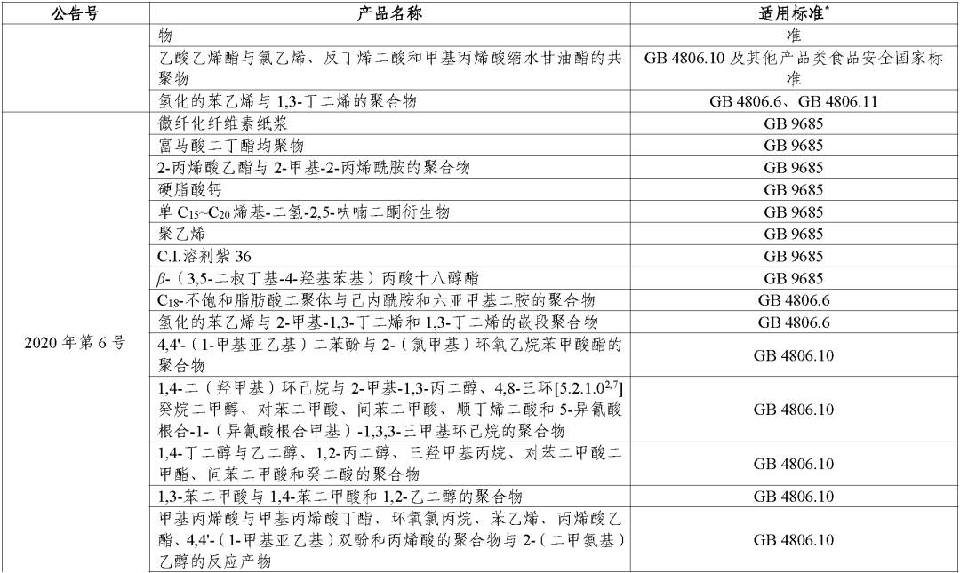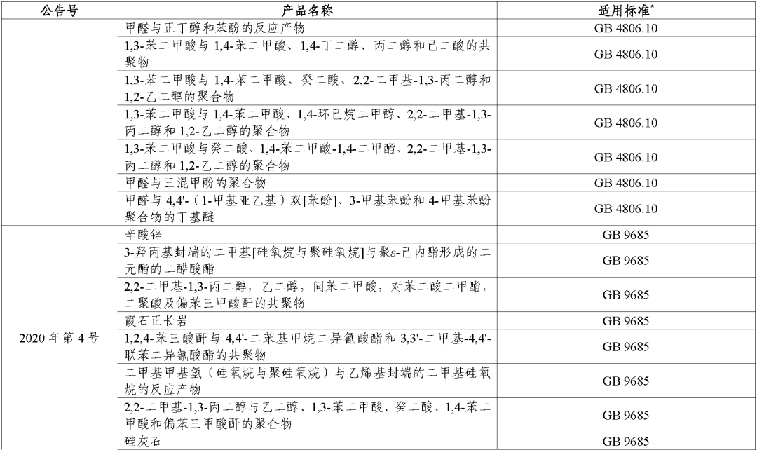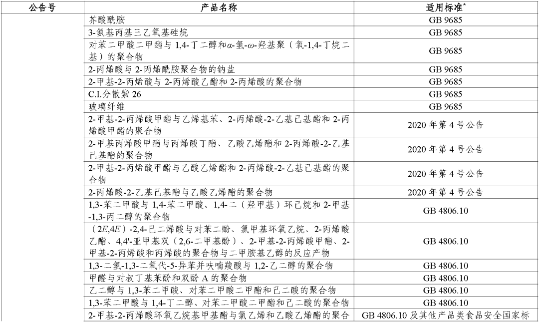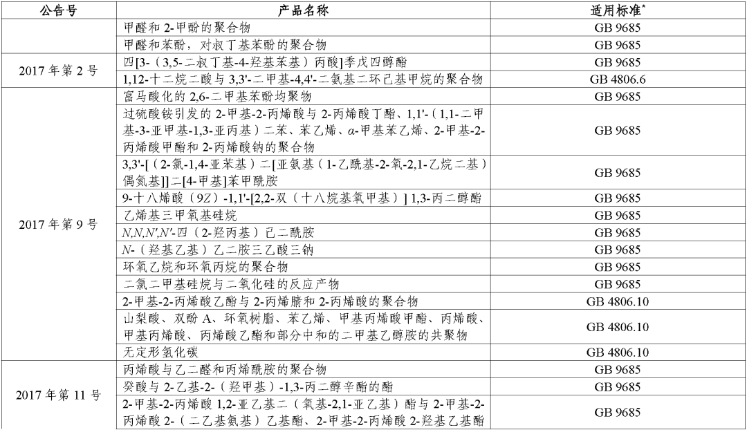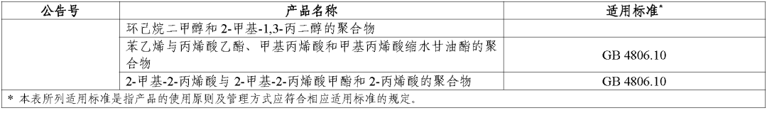 (三)对于公告批准的食品接触材料及制品用基础树脂或新材料,其适用标准为使用范围所对应的产品标准,如塑料材料及制品用基础树脂适用标准为《食品安全国家标准 食品接触用塑料树脂》(GB 4806.6-2016),其中对应多个使用范围的基础树脂分别列出相应类别的产品标准。