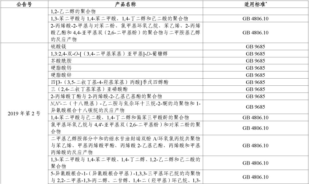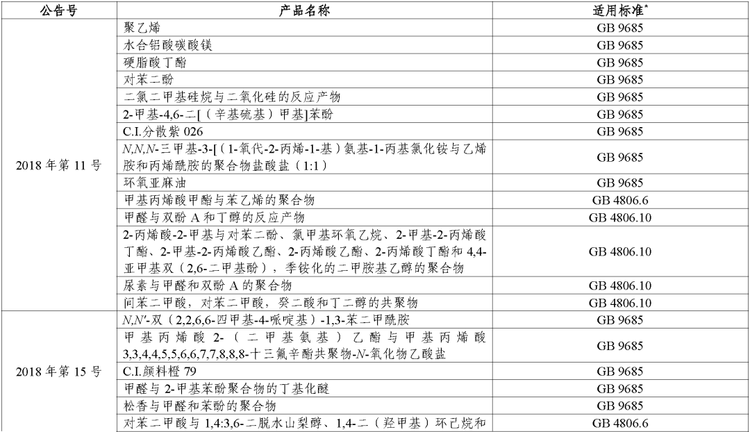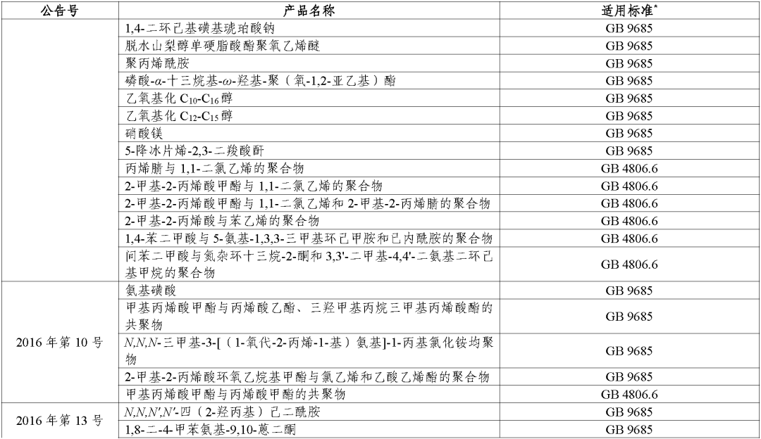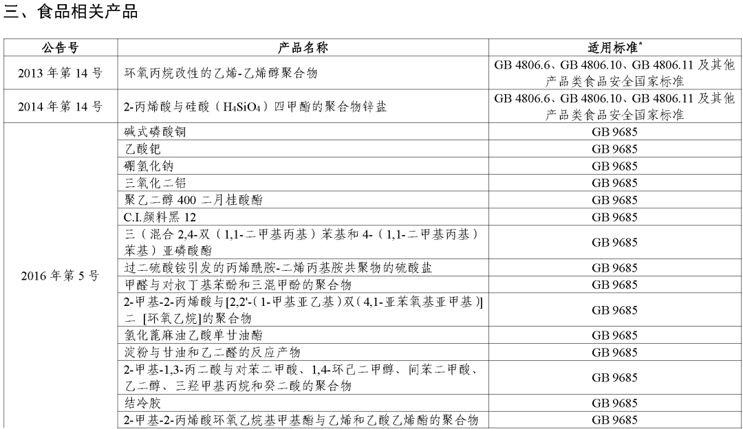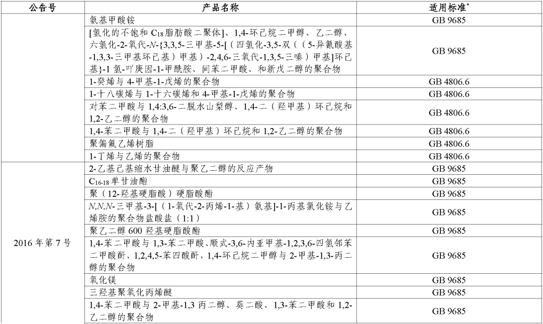 (二)对于公告批准的食品接触材料及制品用添加剂,其适用标准统一为《食品安全国家标准 食品接触材料及制品用添加剂使用标准》(GB 9685-2016)。
