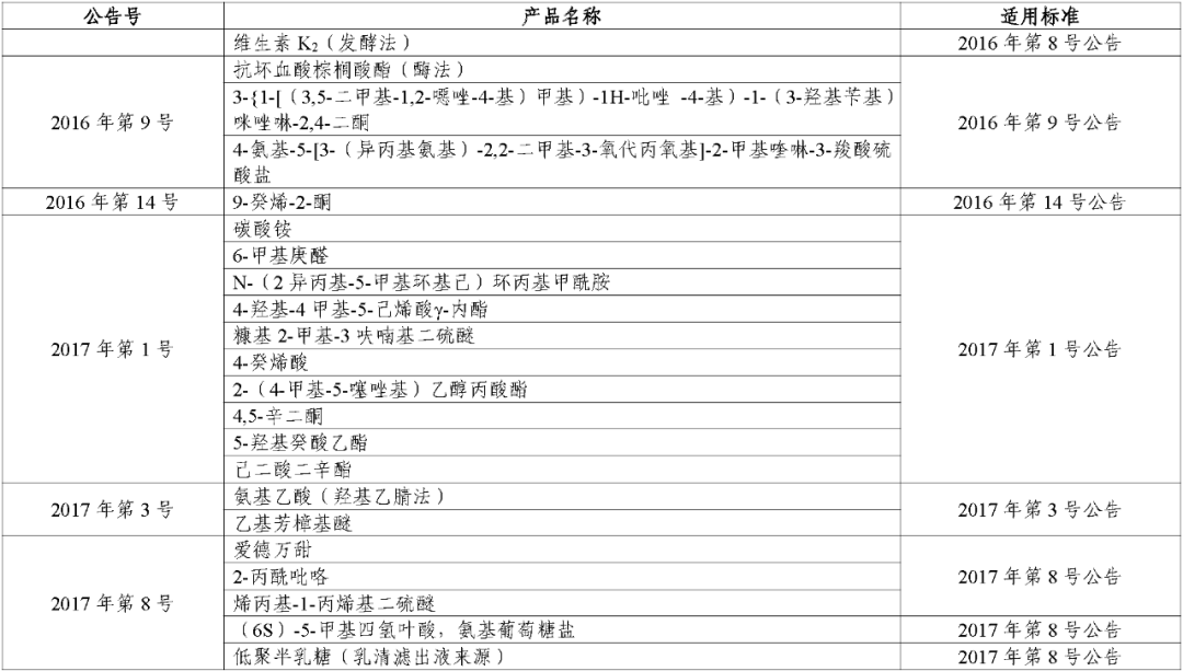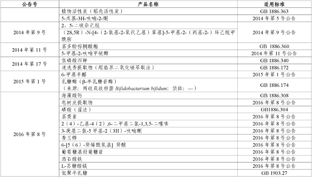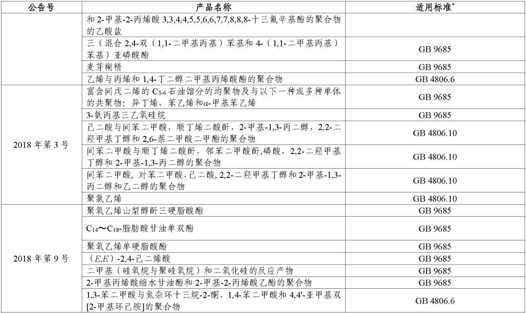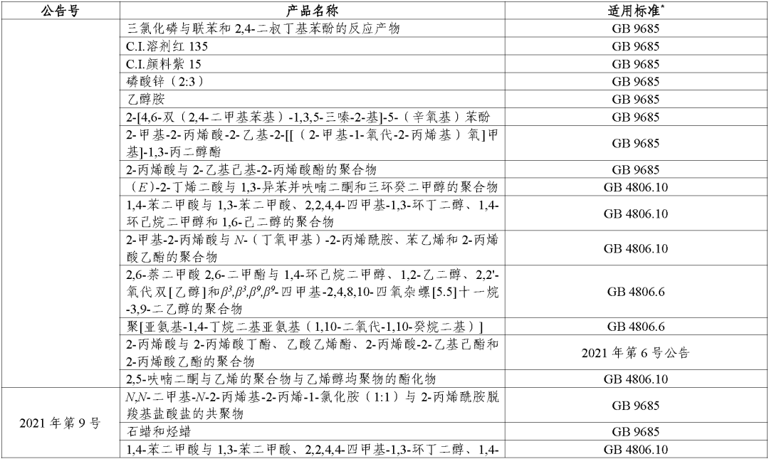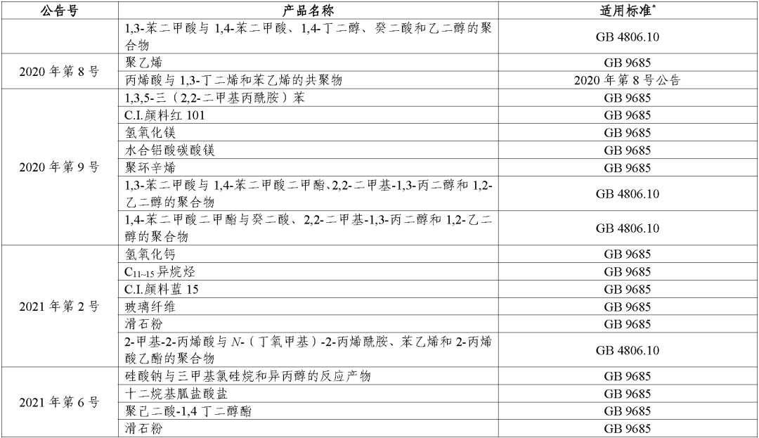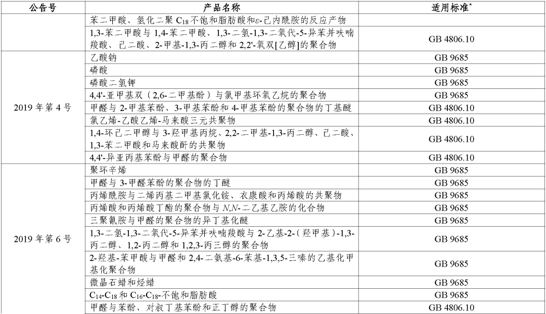 (二)对于公告批准的食品接触材料及制品用添加剂,其适用标准统一为《食品安全国家标准 食品接触材料及制品用添加剂使用标准》(GB 9685-2016)。