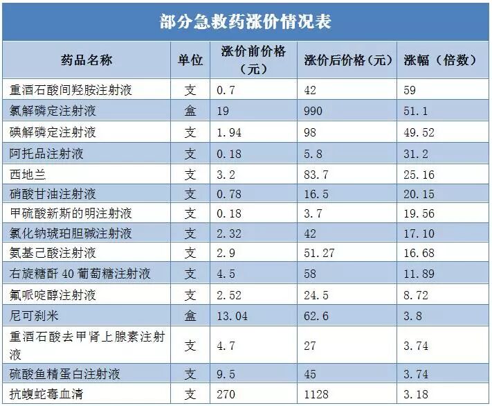 市场监管总局的这张罚单,让不少医患恍然大悟。自2015年以来的急救药短缺、价格暴涨的原因,一切都在这张罚单中。据此前《健康时报》报道,2015年以来绝大部分急救药均在急速涨价,涨幅少的3倍,涨幅大的甚至涨了近60倍。比如,去甲肾腺上素上涨近4倍,西地兰上涨25倍,碘解磷49倍,氯解磷定上涨51倍。上涨幅度最大的是重酒石酸间羟胺注射液,从过去的0.7元/支涨到了42元/支,上涨近60倍。据基金君了解,重酒石酸间羟胺注射液恰恰是去甲肾腺上素在各种早期休克治疗中的可替代药品。综合四川遂宁市中心医院、清华大学长庚医院等医院的数据,截至2018年11月8日。而其他多种价格暴涨的急救药品的背后都有远大医药的身影。价格涨了51倍的氯解磷定,是由上海旭东海普药业独家生产。这家企业原为中国第一针剂厂海普药厂(现为上海医药工业公司)与台湾东洋国际股份有限公司合资建立的企业。2018年,远大医药(中国)公司以15.4亿元收购了旭东海普原台湾东洋国际股份有限公司所占的55%股份后,剩下的45%股份由上海医药工业公司占有。此外,据上海旭东海普的官网数据显示,该公司最为著名的急救药品西地兰注射液市场占有率超过80%,几乎垄断中国市场。据国家市场监管总局数据显示,西地兰生产企业只有上海旭东海普药业以及成都倍特药业。另外,上海旭东海普药业独家生产的氯解磷定在中国大陆的市场占有率居第一位。溴己新、氟尿嘧啶、醋酸曲安奈德等药品,在全国市场占有率排名也是前三。同为急救药的去甲肾上腺素虽然有3家药企在生产,但是根据辽宁省集采小组办公室发布《关于发布辽宁省易短缺药品2018年第3号预警预报的通知》显示,去甲肾上腺素生产厂家之一的远大医疗(中国)有限公司,自述由于采购不到原料药而申请停产。上海禾丰制药则表示,他们的原料药也来自于远大医疗,他们也面临没有原料药的风险。刚刚,港股上市公司远大医药发布公告称,附属公司高度重视并积极配合国家市场监督管理局的调查,接受出发并根据要求组织整改,已经终止了相关的垄断协议,合法合规的向市场供应相关原料。