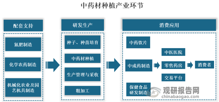 根据观研报告网发布的《中国中药材种植行业现状深度调研与发展前景研究报告(2023-2030年)》显示,中药材种植产业上游环节依托化学农药、肥料及土壤处理、园艺等产品或服务,经过育苗、种植、生产管理、采收与粗加工等环节,向下游环节的中药饮片加工、中成药制造、保健食品研发制造等提供原料,并最终为中医医院、药材市场等消费终端提供产品。