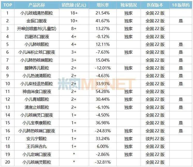 表1:2022年中成药儿科用药TOP20产品注:销售额低于1亿元用*表示