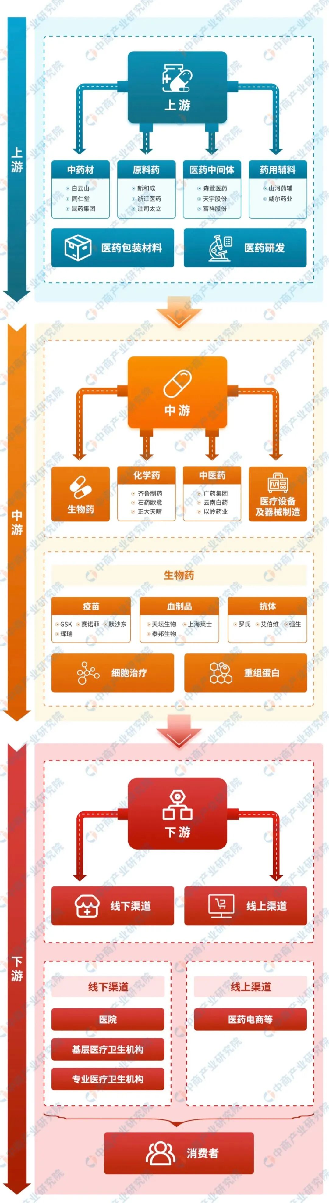 生物医药上游为中药材、原料药、医药中间体、药用辅料、医药包装材料及医药研发;中游包括各类生物药、化学药、中医药、医疗设备及器械制造;下游药品流至各种线下渠道及线上渠道,最终到达终端消费者手中。
