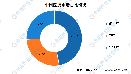 按照分子类型的不同,中国医药市场可分为化学药、生物药以及中药三大板块,其中生物药市场潜力巨大。从市场份额来看,化学药品占比最大,达47.2%;其次为中医药,占比达27%;生物药占比达25.8%。
