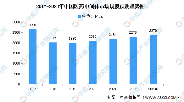 随着大型跨国制药公司产业结构调整和国际分工的进一步细化,我国已形成从科研开发到生产销售的完整医药中间体产业体系,并已成为医药行业全球分工中重要的中间体生产大国和全球主要的医药中间体出口大国,2021年中国医药中间体市场规模达2184亿元,同比增长4.5%。2022年我国医药中间体市场规模达2278亿元,2023年将达2379亿元。