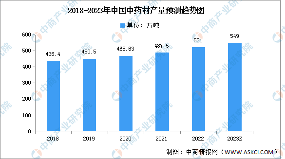 我国中药材品种达一千多种,常用的六百多种中药材中,有三百多种已实现人工种养,栽培、养殖中药材品种的产量占中药材供应量的70%以上。随着中药材种植面积持续扩大,国内中药材产量保持平稳增长的趋势。2022年中药材产量为521.0万吨,预计2023年产量将达到531万吨。