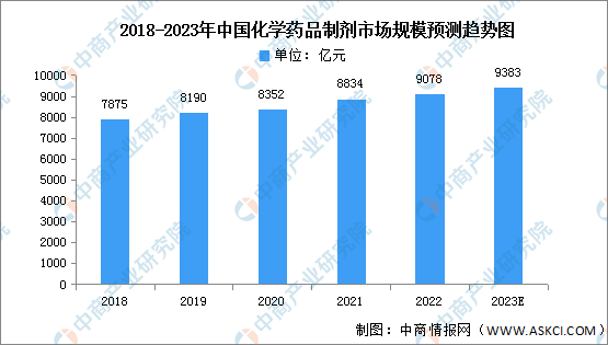 随着国内需求和出口量不断增加,我国化学药品制剂行业市场规模持续扩大,2022年我国化学药品制剂市场规模达9078亿元。在居民收入持续提升、人口数量不断增长、人口老龄化进程加快、医保体系逐渐健全及政府医药卫生支出不断增加的背景下,药物市场需求大幅增加,化学药品制剂行业发展迅速,预计2023年我国化学药品制剂市场规模将达9383亿元。