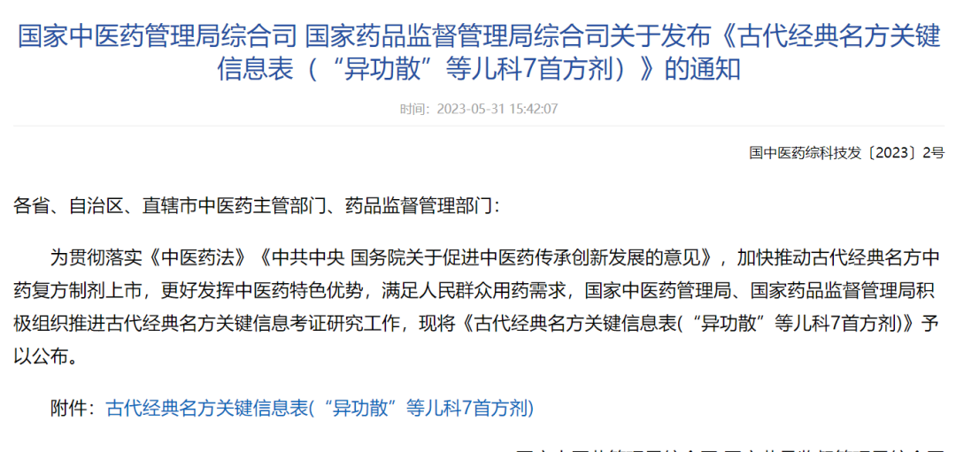 5月31日,国家中医药管理局网站发布《国家中医药管理局综合司 国家药品监督管理局综合司关于发布〈古代经典名方关键信息表(“异功散”等儿科7首方剂)〉的通知》。