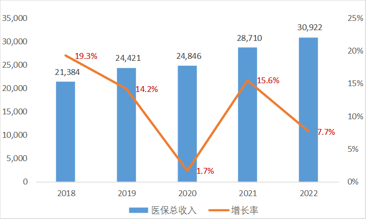 回顾近年的医保基金收入增速,除疫情初期医保局减半征收外,增速大多在10%以上,而2022年医保基金收入为3.09万亿元,同比增长仅为7.7%,正式落入个位数增速时代。