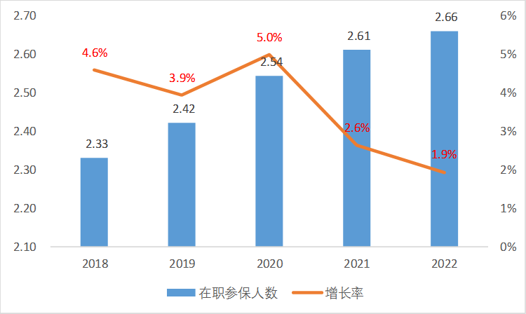 图表2:2018-2022年在职职工参保人数统计 (单位:亿人)